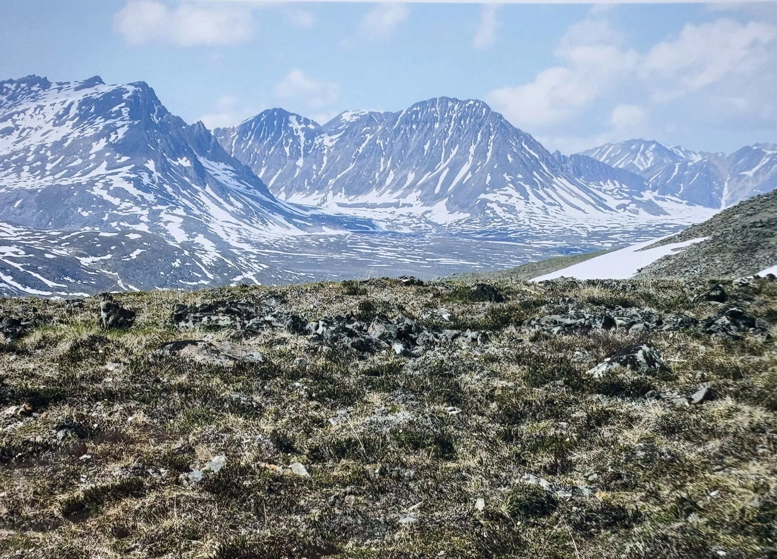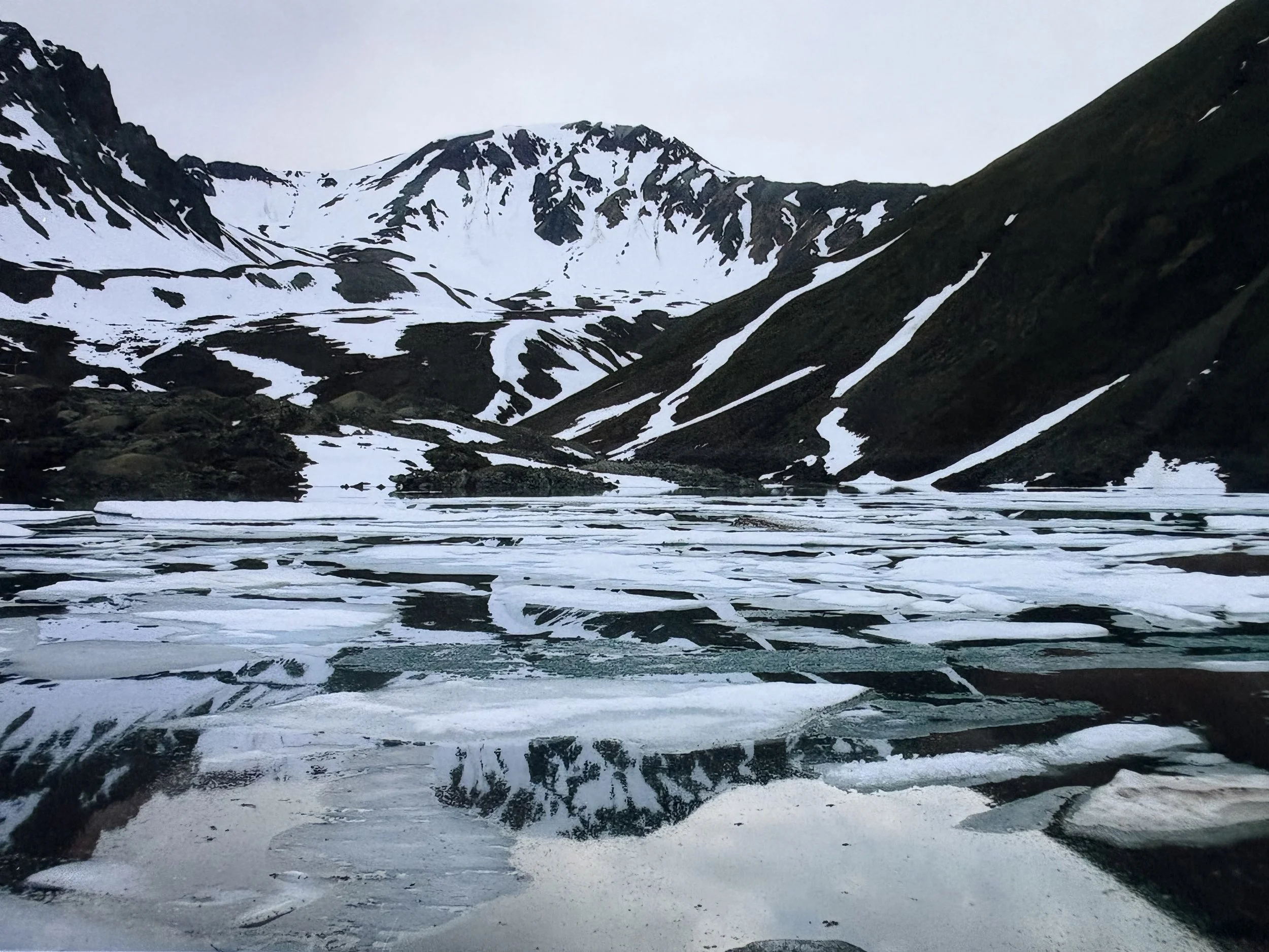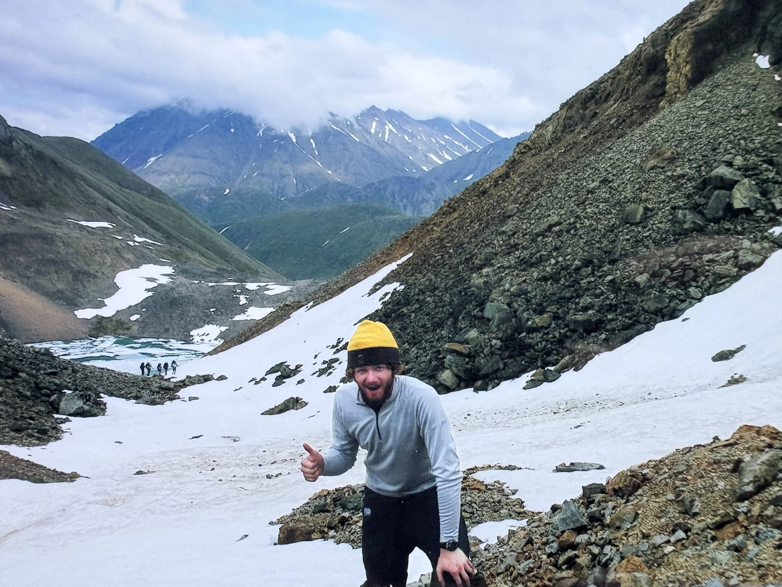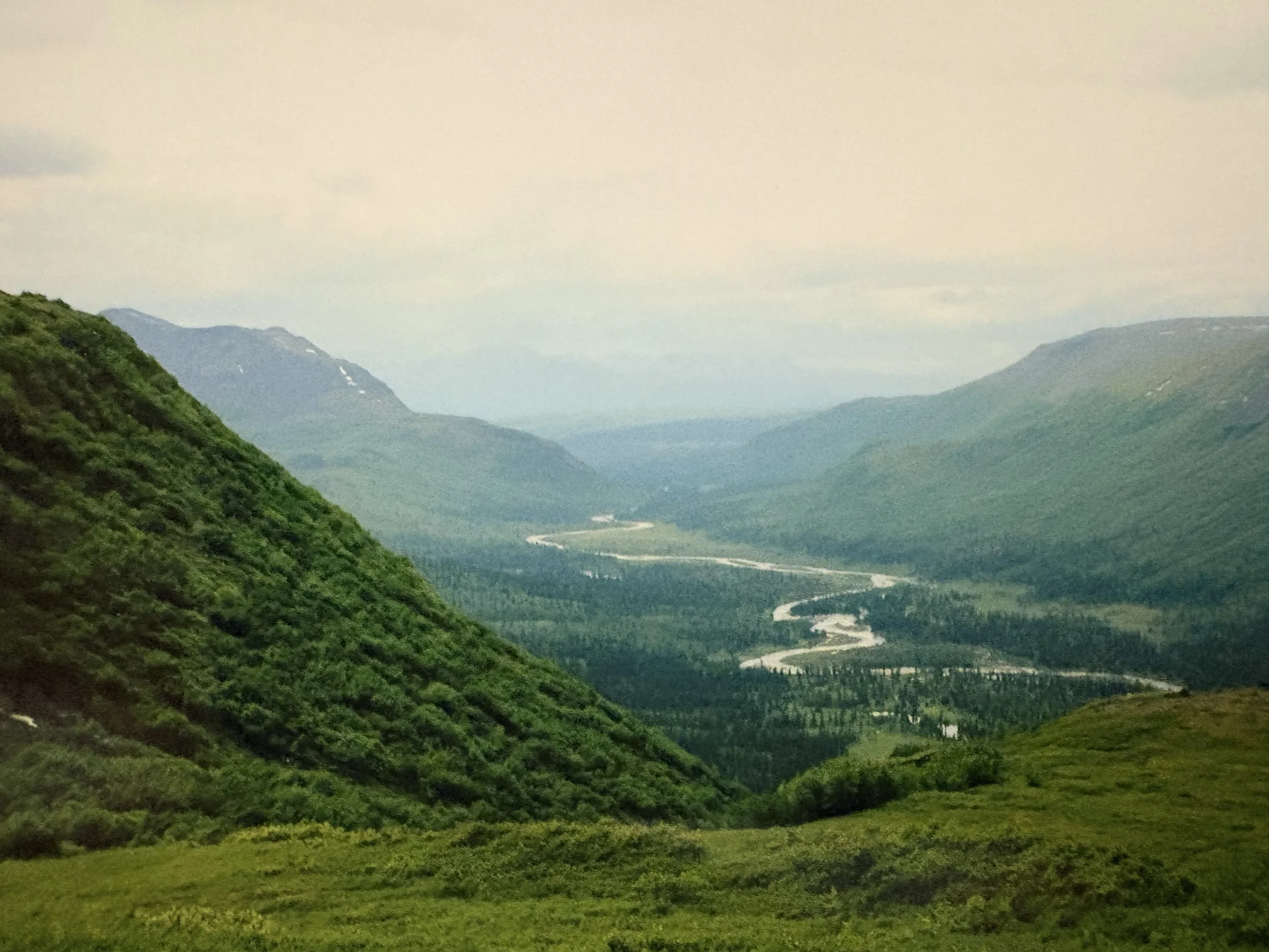 As most of our time had been spent ascending snowy ridges up in the clouds, away from the lower elevations, I did not know what to expect. As I approached the descent, I could only see a green patch of tundra sloping upwards ahead and the blue sky beyond. When I peeked over the edge of the mountain there suddenly was a clear view. Before me was a lush expansive valley that startled me with beauty.